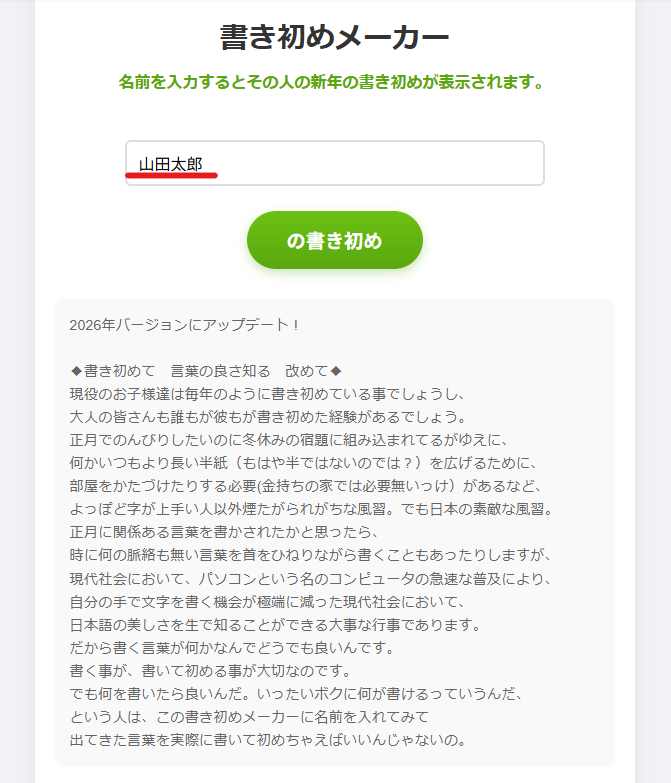 書き初めメーカーとは、名前やキーワードを入力するだけで、書き初め風の画像を自動生成してくれるWebコンテンツ のこと。