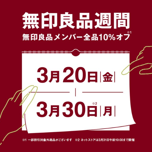 無印良品週間は、無印良品メンバーを対象に 全品10%オフ で購入できる人気キャンペーンです。