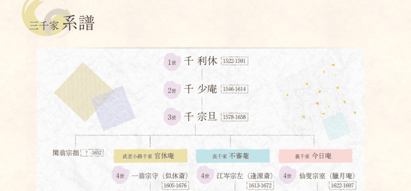 宗旦には4人の息子がいましたが、そのうち3人が茶道の家元として独立し、現在の三千家が成立しました。