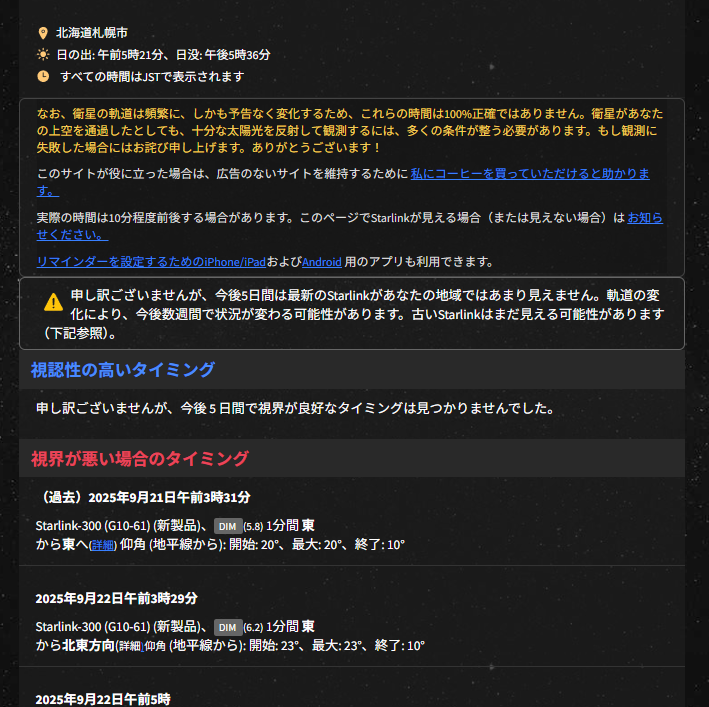 ※上の画像はサイト「Find Starlink」の画面上で右クリックして「日本語に翻訳」しています。