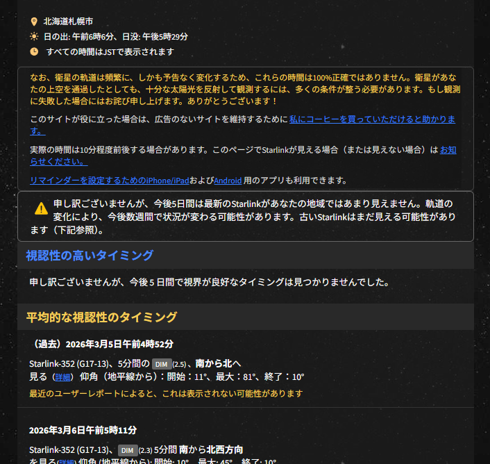 スターリンク衛星:今日の北海道(札幌)は? 2026/03/06~