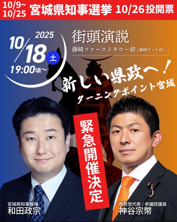 街頭演説には、神谷宗幣(参政党代表)や梅村みずほ(参政党議員)が応援に入り、仙台では600人、1000人を超える聴衆が詰めかけた。また、期日前投票が前回比で31倍、約4万人を突破し、県内外で“政治の地殻変動”と囁かれている。